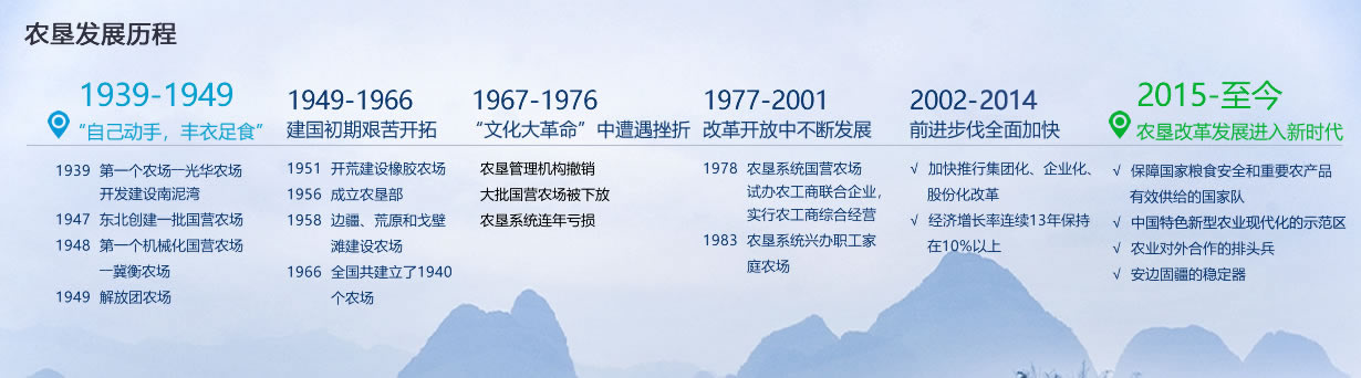 第五階段:農(nóng)墾改革發(fā)展進(jìn)入新時(shí)代(2015年至今)。2015年11月27日,中共中央、國(guó)務(wù)院印發(fā)《關(guān)于進(jìn)一步推進(jìn)農(nóng)墾改革發(fā)展的意見(jiàn)》。以此為標(biāo)志,農(nóng)墾改革發(fā)展進(jìn)入新時(shí)代。文件指出,新形勢(shì)下農(nóng)墾承擔(dān)著更加重要的歷史使命。努力把農(nóng)墾建設(shè)成為保障國(guó)家糧食安全和重要農(nóng)產(chǎn)品有效供給的國(guó)家隊(duì)、中國(guó)特色新型農(nóng)業(yè)現(xiàn)代化的示范區(qū)、農(nóng)業(yè)對(duì)外合作的排頭兵、安邊固疆的穩(wěn)定器。全國(guó)農(nóng)墾貫徹落實(shí)中央農(nóng)墾改革發(fā)展文件精神,用3年左右時(shí)間基本完成了農(nóng)墾國(guó)有土地使用權(quán)確權(quán)登記發(fā)證和改革國(guó)有農(nóng)場(chǎng)辦社會(huì)職能任務(wù)。墾區(qū)集團(tuán)化和農(nóng)場(chǎng)企業(yè)化改革穩(wěn)步推進(jìn),建設(shè)現(xiàn)代農(nóng)業(yè)大基地、大企業(yè)、大產(chǎn)業(yè),把農(nóng)墾建設(shè)成為具有國(guó)際競(jìng)爭(zhēng)力的現(xiàn)代農(nóng)業(yè)企業(yè)集團(tuán),努力形成農(nóng)業(yè)領(lǐng)域的航母。