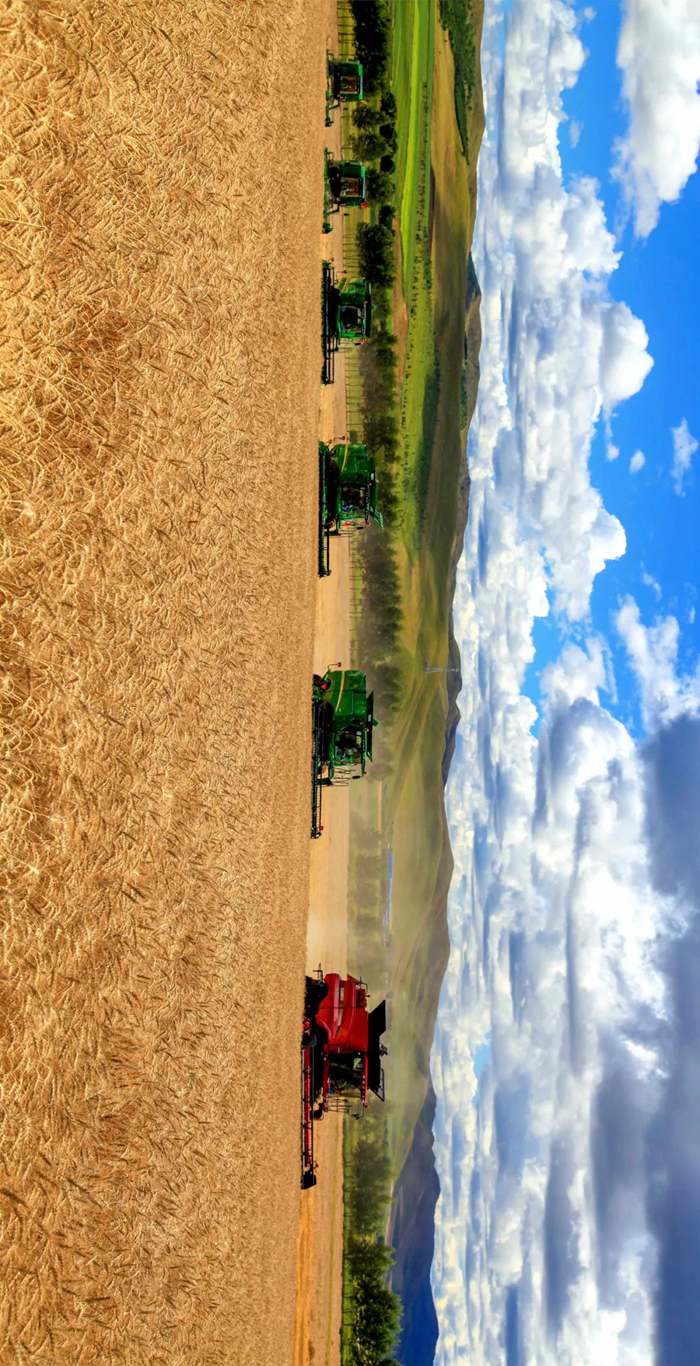 《田疇“畫”豐收》 內(nèi)蒙古興安農(nóng)墾索倫牧場(chǎng)規(guī)模化經(jīng)營(yíng)管理區(qū)小麥?zhǔn)崭钭鳂I(yè)。王福財(cái) 攝