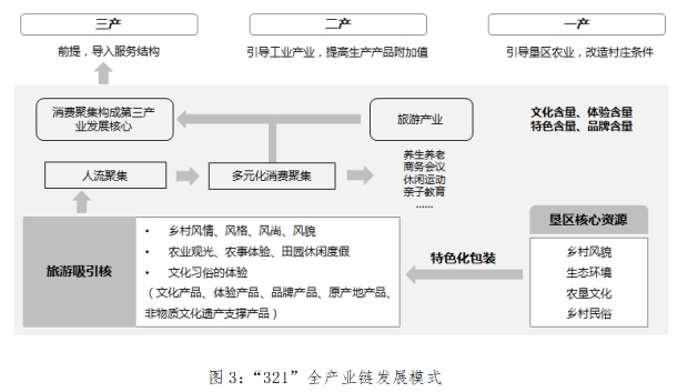 因此,農墾系統(tǒng)的“321”全產業(yè)鏈發(fā)展模式,強調三產之間的互動效率和產業(yè)能力提升。這一模式以墾區(qū)核心資源的分析挖掘為起點,通過對資源的特色化、產品化包裝形成旅游產業(yè)的吸引物、吸引核,以聚集人氣,形成旅游引導的消費聚集,并轉化為消費產業(yè)的就業(yè)供給側聚集,最終形成以旅游產業(yè)為核心的三產服務結構,進而引導加工產業(yè)發(fā)展,帶動墾區(qū)農業(yè)轉型,形成產業(yè)發(fā)展的可持續(xù)結構。