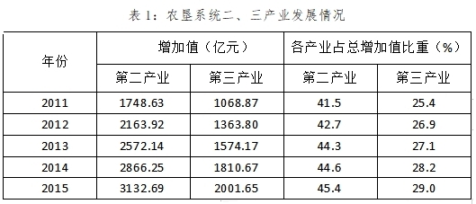 《中國農墾統(tǒng)計年鑒》顯示,從2011年至2015年,農墾系統(tǒng)二、三產業(yè)增加值持續(xù)上升,2014年和2015年第三產業(yè)的增加值占比均超越了第一產業(yè),詳見表1。