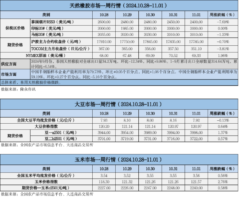 天然橡膠、大豆、玉米市場一周行情(2024.10.28-11.01)