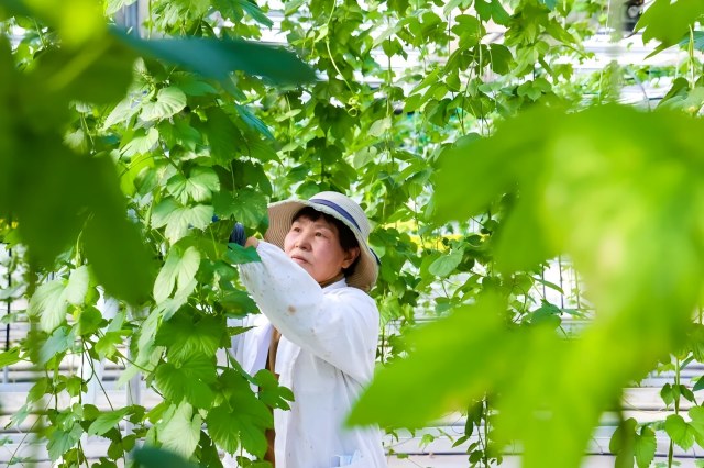 在云臺(tái)農(nóng)場(chǎng)興墾科技的現(xiàn)代智能玻璃溫室大棚里,今年第一茬啤酒花剛剛采收完畢。尚未采收的啤酒花仍在蓬勃生長(zhǎng),一株株順著吊蔓繩向上攀緣。農(nóng)場(chǎng)采用了國(guó)內(nèi)領(lǐng)先的無(wú)土栽培模式,以粗細(xì)椰糠為基質(zhì),配合空氣源溫控、漫散射玻璃、水肥一體化滴灌等先進(jìn)技術(shù),精準(zhǔn)復(fù)刻并優(yōu)化了啤酒花的理想生長(zhǎng)環(huán)境。