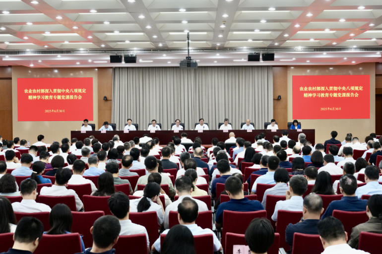 6月30日,農(nóng)業(yè)農(nóng)村部黨組召開深入貫徹中央八項規(guī)定精神學習教育專題黨課報告會,部黨組書記、部長韓俊作專題黨課報告,中央第四指導(dǎo)組組長車俊、副組長郝平到會指導(dǎo)。會議強調(diào),部系統(tǒng)各級黨組織和廣大黨員干部要深入學習貫徹習近平總書記關(guān)于加強黨的作風建設(shè)的重要論述,落實中央部署和中央指導(dǎo)組要求,持續(xù)推動學習教育走深走實,持之以恒深化部系統(tǒng)作風建設(shè),營造風清氣正的良好政治生態(tài),為推進鄉(xiāng)村全面振興、加快建設(shè)農(nóng)業(yè)強國提供堅強保障。