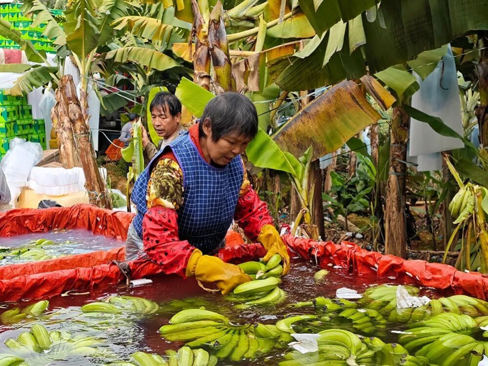 12月5日,在天等縣把荷鄉(xiāng)萬(wàn)合村的香蕉種植基地里,翠綠的蕉葉層層疊疊,沉甸甸的香蕉掛滿枝頭。村民們手持鐮刀穿梭林間,熟練地收割成熟香蕉,并將它們通過(guò)索道快速運(yùn)至分揀區(qū)進(jìn)行分割、清洗、分揀、稱重、包裝等各環(huán)節(jié)工作。隨后,一箱箱打包完好的香蕉陸續(xù)裝車,發(fā)往山東省濟(jì)南市的商超和批發(fā)市場(chǎng)。