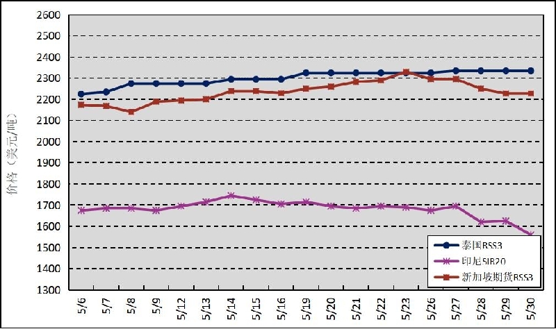 國外主產(chǎn)區(qū):5月,泰國RSS3平均價(jià)格為2302美元/噸,環(huán)比上漲93美元/噸,最高價(jià)為2335美元/噸,最低價(jià)為2225美元/噸;印尼SIR20平均價(jià)格為1682美元/噸,環(huán)比上漲9美元/噸,最高價(jià)為1745美元/噸,最低價(jià)為1560美元/噸;新加坡RSS3期貨主力合約月均結(jié)算價(jià)格為2236美元/噸,環(huán)比上漲61美元/噸,最高價(jià)為2330美元/噸,最低價(jià)為2140美元/噸。