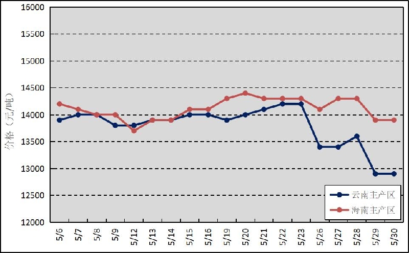 國內(nèi)主產(chǎn)區(qū):5月,全國天然橡膠主產(chǎn)區(qū)全面開割,全月降雨偏多,影響收膠作業(yè)。海南產(chǎn)區(qū)白粉病偏重度流行,橡膠樹落葉情況時有發(fā)生。云南、海南鮮膠乳(折干膠)月均價(jià)格分別為13784元/噸、14111元/噸。