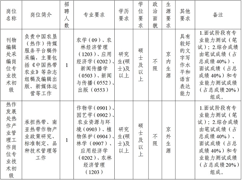 根據(jù)農(nóng)業(yè)農(nóng)村部在京單位2025年度公開招聘應屆高校畢業(yè)生工作的統(tǒng)一安排,現(xiàn)就中國農(nóng)墾經(jīng)濟發(fā)展中心(農(nóng)業(yè)農(nóng)村部南亞熱帶作物中心)2025年度公開招聘應屆高校畢業(yè)生有關(guān)事項補充公告如下:
