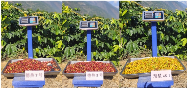 “德熱7號”系云南省德宏熱帶農(nóng)業(yè)科學研究所從葡萄牙熱帶研究所(IICT)咖啡銹病研究中心(CIFC)引進育種材料SL18-Sarchimor選育而成,“瑞墾48-1”系云南省德宏熱帶農(nóng)業(yè)科學研究所從農(nóng)業(yè)農(nóng)村部瑞麗咖啡種質(zhì)資源圃咖啡種質(zhì)Catimor P129群體中發(fā)現(xiàn)的橙黃色變異單株經(jīng)系統(tǒng)選擇法培育而成。兩個品種均完成了品種比較試驗、區(qū)域性試驗和生產(chǎn)性試驗。“德熱7號”具有生勢強,二、三分枝發(fā)達,抗銹性強,杯品質(zhì)量好等優(yōu)點,經(jīng)現(xiàn)場測產(chǎn),潞江壩試驗點平均單株鮮果重6.01kg,按畝植333株折合,畝產(chǎn)鮮果2001.33kg;瑞麗試驗點平均單株鮮果重5.21kg,按畝植333株折合,畝產(chǎn)鮮果1734.93kg?!叭饓?8-1”具有葉片大而厚,植株生勢強,杯品質(zhì)量好,青瓜風味明顯等優(yōu)點,經(jīng)現(xiàn)場測產(chǎn),潞江壩試驗點平均單株鮮果重5.34kg,按畝植333株折合,畝產(chǎn)鮮果1778.22kg;瑞麗試驗點平均單株鮮果重5.05kg,按畝植333株折合,畝產(chǎn)鮮果1681.65kg。