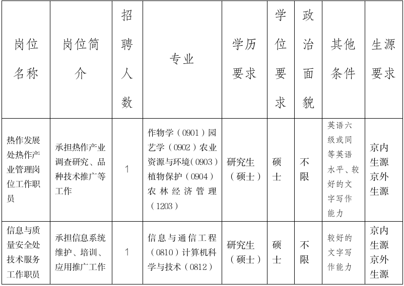 6.根據(jù)北京市疫情防控要求,我單位將隨時調(diào)整招聘工作有關(guān)安排。請考生及時關(guān)注中國農(nóng)業(yè)農(nóng)村人才網(wǎng)、中國農(nóng)墾(熱作)網(wǎng)相關(guān)信息。