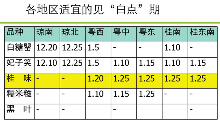 原因分析:秋冬季日照時(shí)間長(zhǎng)、光照充足、天氣溫暖,是荔枝光合積累的黃金時(shí)期。貯藏碳水化合物除滿足成花需求之外,也供給開花和初期坐果之需。荔枝在葉片轉(zhuǎn)綠之后才能進(jìn)入凈光合狀態(tài)。以見 “白點(diǎn)”時(shí)間為節(jié)點(diǎn),秋梢老熟時(shí)間越長(zhǎng),凈光合積累時(shí)間越長(zhǎng),積累和貯藏碳水化合物量越多。