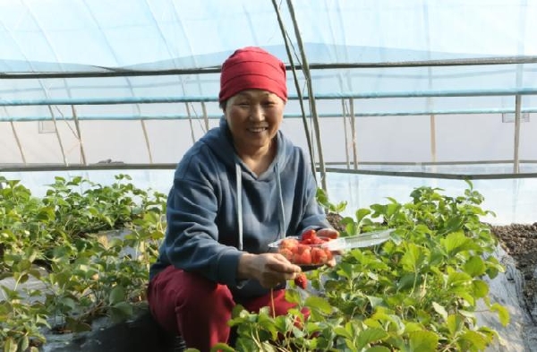 “把小果病果剪掉,讓果與果之間保留一定空間,減少養(yǎng)分流失,促進果粒大小均勻、著色度好,提高草莓的品質(zhì)?!痹?2號溫室大棚內(nèi),幾個工人正忙碌地對草莓果子進行修剪、疏果,技術(shù)指導孟憲民在一旁邊說邊示范,目前草莓正值盛產(chǎn)期,為了保證品質(zhì),每天他都會來草莓大棚“遛園”,讓草莓生長達到最佳狀態(tài)。目前,大觀園的草莓處于成熟期,草莓個頭大、口感好,采摘價格在40元每斤,比市場上的草莓價格要高一些,但是因為紅顏草莓口感香甜,贏得了不少采摘者前來享受“莓”好時光。