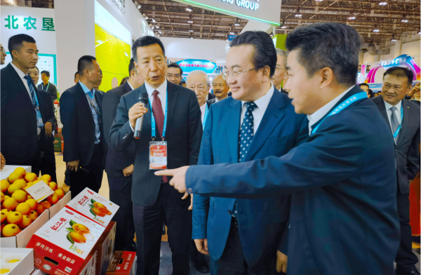 農(nóng)業(yè)農(nóng)村部黨組成員、副部長(zhǎng)鄧小剛(前排中),農(nóng)業(yè)農(nóng)村部農(nóng)墾局一級(jí)巡視員程景民(前排左),廣東省農(nóng)墾集團(tuán)公司(農(nóng)墾總局)黨委委員、副總經(jīng)理(副局長(zhǎng))莫仕文(前排右)到廣東農(nóng)墾展位調(diào)研指導(dǎo)