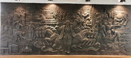 場(chǎng)史館主題銅質(zhì)浮雕由中央美院壁畫系教師杜飛制作,位于館中心,與正門相對(duì),長(zhǎng)6米,高2米。浮雕以“十六掛馬車建場(chǎng)”為主題,集中反映了農(nóng)場(chǎng)艱苦創(chuàng)業(yè)、奮斗、勇于開拓的輝煌歷程。