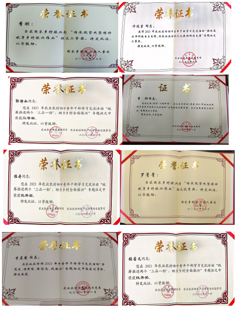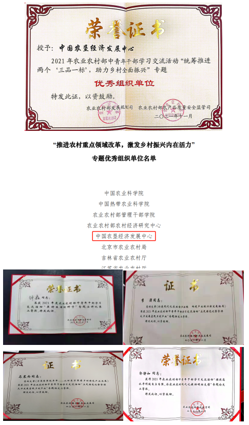10. 在2021年農(nóng)業(yè)農(nóng)村部中青年干部交流論壇中,中國農(nóng)墾經(jīng)濟(jì)發(fā)展中心分獲專題二及專題三優(yōu)秀組織單位;青年同志累計投稿27篇,獲獎16項,其中,鐘鑫、桂丹、李瀟、馬晨雨、郭靜如、季剛獲得二等獎;許冠堂、郭靜如、季剛獲得三等獎;桂丹、羅菁菁、李晨萌、張若凡獲得優(yōu)秀獎;鐘鑫還獲得專題七演講比賽二等獎。在“永遠(yuǎn)跟黨走”農(nóng)業(yè)農(nóng)村部慶祝中國共產(chǎn)黨成立100周年職工書畫攝影展中,羅菁菁同志獲得“攝影類三等獎”。