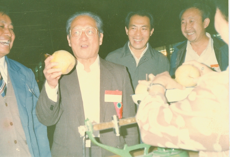 9月27日晚上7-10時(shí),展銷會(huì)安排專賣展銷,主要是黨中央、國(guó)務(wù)院領(lǐng)導(dǎo)人和各部委辦負(fù)責(zé)人來(lái)展銷會(huì)參觀、購(gòu)物。晚上八點(diǎn)多,何康等部領(lǐng)導(dǎo)先后來(lái)到安徽展銷點(diǎn)參觀。何康駐足碭山酥梨柜臺(tái),隨手拿起一個(gè)金黃的酥梨在手心里掂量著,對(duì)陪同在旁的安徽農(nóng)墾代表團(tuán)團(tuán)長(zhǎng)周維成說道:“我來(lái)替你們宣傳。”安徽?qǐng)F(tuán)工作人員手持照相機(jī)對(duì)著這個(gè)場(chǎng)面按下快門,留下本文開頭介紹的那個(gè)寶貴鏡頭。何康說過這句話之后,把梨子放回原處。呂清問碭山梨一個(gè)有多重,隨團(tuán)的碭山果園場(chǎng)售貨員立即拿一個(gè)梨放在磅秤上,“一斤四兩重”,何康開懷大笑。