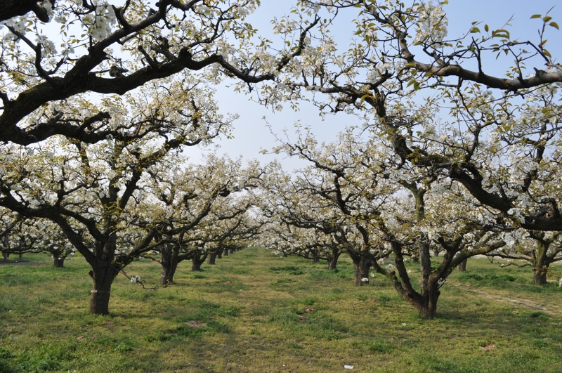 碭山,位于蘇、魯、豫、皖四省交界處,素有“世界梨都”之稱,每年陽(yáng)春三月,春和景明時(shí)節(jié),碭山大地萬(wàn)物復(fù)蘇,故黃漲綠,數(shù)十萬(wàn)畝梨花吐蕊綻蕾,競(jìng)相盛開。放眼環(huán)顧,雪堆云涌,銀波瓊浪,沃野千頃,一片花海,景象蔚為壯觀。到八月中秋,遍地金珠墜地,碭山又是果的世界,田間地頭又成了果山果海,到處人歡車?guó)Q,芳香鋪地。置身其間,徜徉園圃,品嘗酥梨似蜜之甘甜,令人樂不思?xì)w,流連忘返。始建于1955年的安徽農(nóng)墾碭山果園場(chǎng)就坐落在這里。