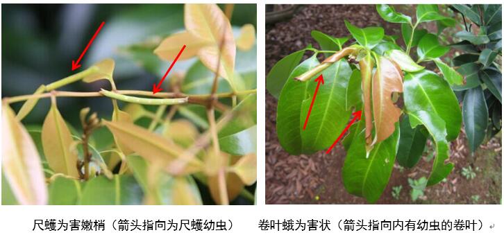 荔枝尺蠖和卷葉蛾均屬鱗翅目的蛾類,成蟲通常在5cm左右長荔枝嫩梢葉片上產(chǎn)卵,卵孵化后幼蟲咬食嫩梢嫩葉,隨著幼蟲齡期的增長,其食量逐漸加大,嚴(yán)重時(shí)整株枝嫩葉被食光。因此,在新梢長5cm左右和第1—2復(fù)葉張開前,是噴藥防治的最佳時(shí)期。