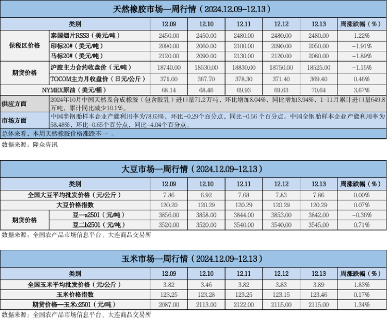 天然橡膠、大豆、玉米市場(chǎng)一周行情(2024.12.09-12.13)