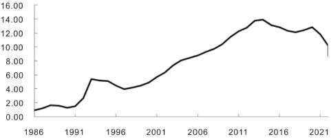 城鎮(zhèn)化進(jìn)程,帶來房地產(chǎn)業(yè)的迅猛發(fā)展,“城鎮(zhèn)化紅利”造就巨大的“房地產(chǎn)紅利”,而房地產(chǎn)投資占GDP的比重從20世紀(jì)90年代后半期一直到2018年左右,一直呈直線上升趨勢,2015年達(dá)到13%左右(見圖3)。房地產(chǎn)經(jīng)濟(jì)的迅猛增長,既是拉動這一階段經(jīng)濟(jì)增長的主要引擎,同時也加劇了這一時期房地產(chǎn)泡沫的形成,房地產(chǎn)泡沫與銀行房地產(chǎn)貸款虛增、地方城投債膨脹和超大規(guī)模基礎(chǔ)設(shè)施建設(shè)一起,為2020年之后我國金融風(fēng)險的大量累積埋下了伏筆。從總體上來說,應(yīng)該從正反兩方面來看待房地產(chǎn)經(jīng)濟(jì):一方面房地產(chǎn)經(jīng)濟(jì)是中國快速城鎮(zhèn)化的產(chǎn)物,城鎮(zhèn)化紅利必然帶來房地產(chǎn)紅利,各國城市化的歷史進(jìn)程都驗證了這一點(diǎn),因此房地產(chǎn)經(jīng)濟(jì)在20世紀(jì)90年代之后的崛起是一個必然現(xiàn)象;另一方面,房地產(chǎn)投資的過快膨脹已經(jīng)脫離了“實體經(jīng)濟(jì)”的范疇,帶有某些金融投機(jī)的性質(zhì),極容易引發(fā)系統(tǒng)性金融風(fēng)險。