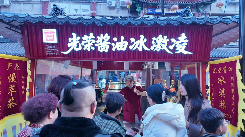 新春佳節(jié),南開區(qū)鼓樓商業(yè)街東街中央張燈結(jié)彩,首次亮相的“鼓樓流水宴”人氣爆棚。在朱紅仿古檔口間,一款“光榮醬油”冰激凌憑借獨(dú)特的咸甜口味脫穎而出,市民游客紛紛駐足,拍照打卡,讓百年老味道在文旅場(chǎng)景中煥發(fā)新生。