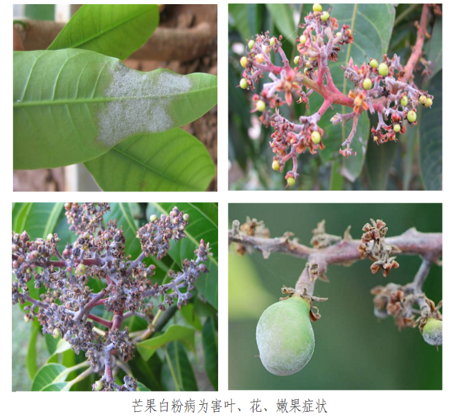 當(dāng)前,廣西、云南、四川、廣東、貴州、福建等主產(chǎn)區(qū)的芒果正處于花果期、果實(shí)膨大期等物候期,果園內(nèi)濕度高、氣溫低,芒果白粉病易于發(fā)生危害。開始時該病害在葉片上產(chǎn)生白色粉狀物,逐漸在老葉上產(chǎn)生紅褐色病斑;侵染花穗時,在花穗上產(chǎn)生白色粉狀物,小花穗褐色枯死,降低坐果率,落花落果嚴(yán)重;侵染幼嫩果實(shí)時,白色粉狀物覆蓋幼果,果皮逐漸凹陷、粗糙,產(chǎn)生紅褐色銹狀物。